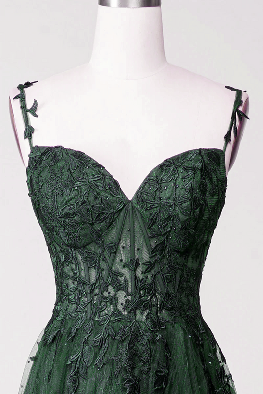 solvbao Dark Green Tulle with Lace Beaded Straps Prom Dress, Green Long Formal Dress Party Dress
