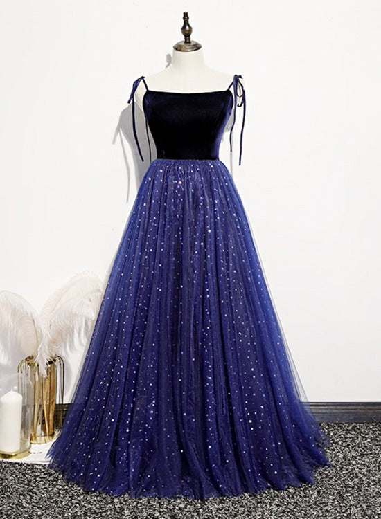 Solvbao Blue Sparkle Tulle with Velvet Top Straps Long Formal Dress, A-line Simple Party Dress