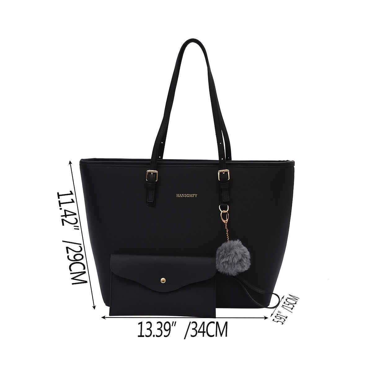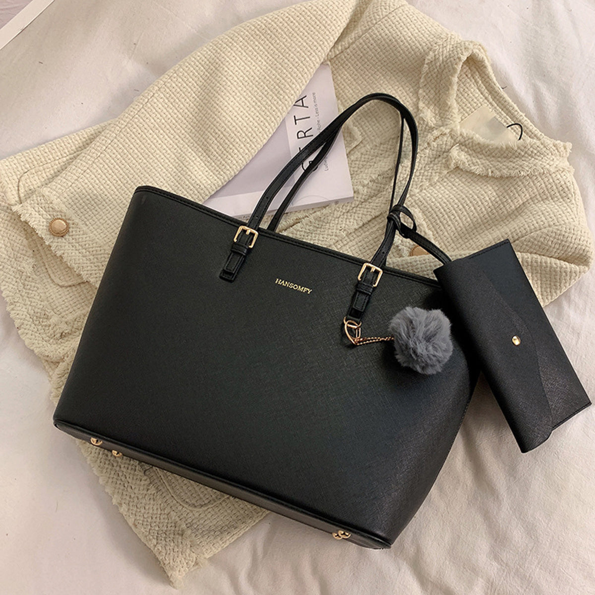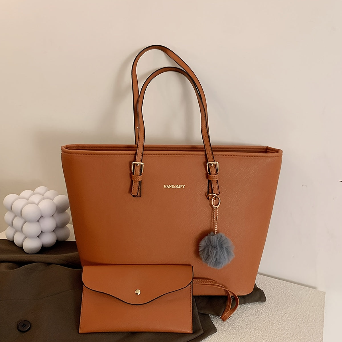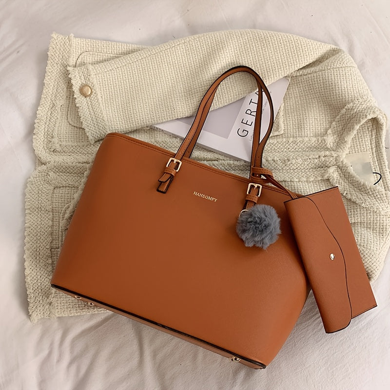 Classic Simple Tote Shoulder Bag, Solid Color Faux Leather Handbag, Large-capacity Bag With Pom Pom & Mini Bag
