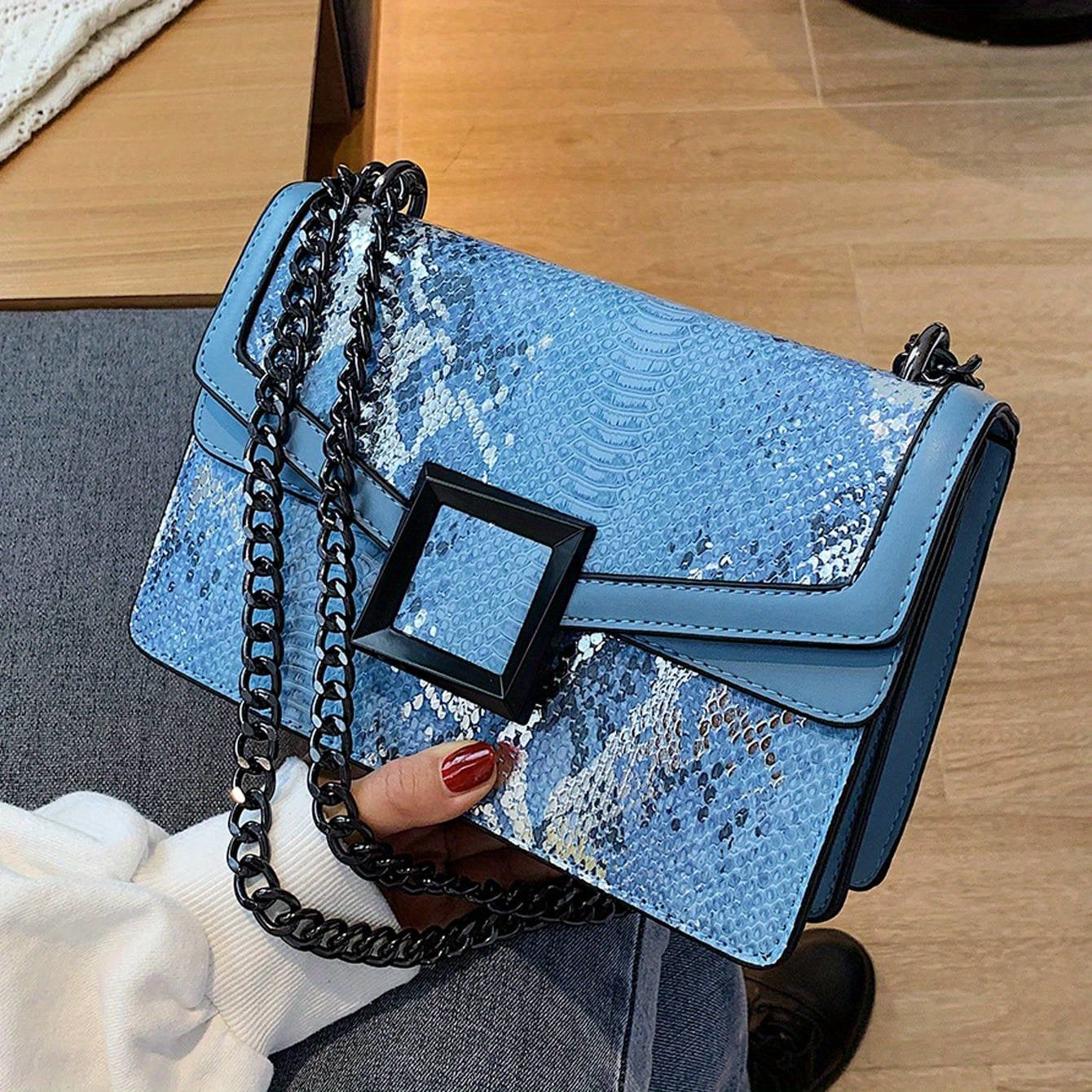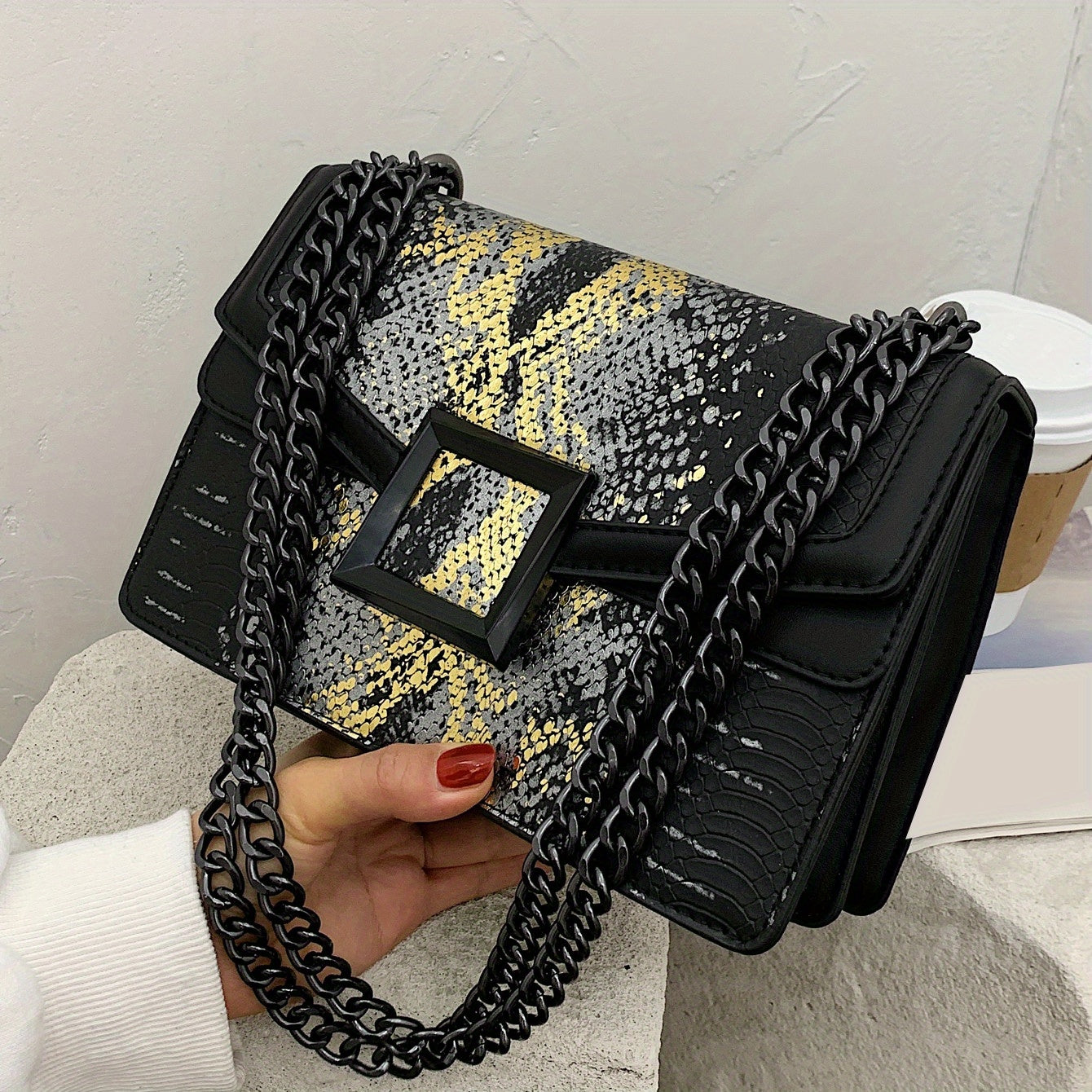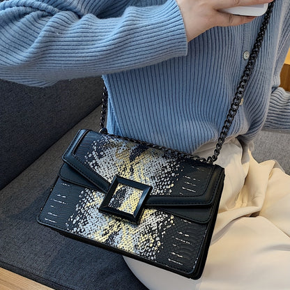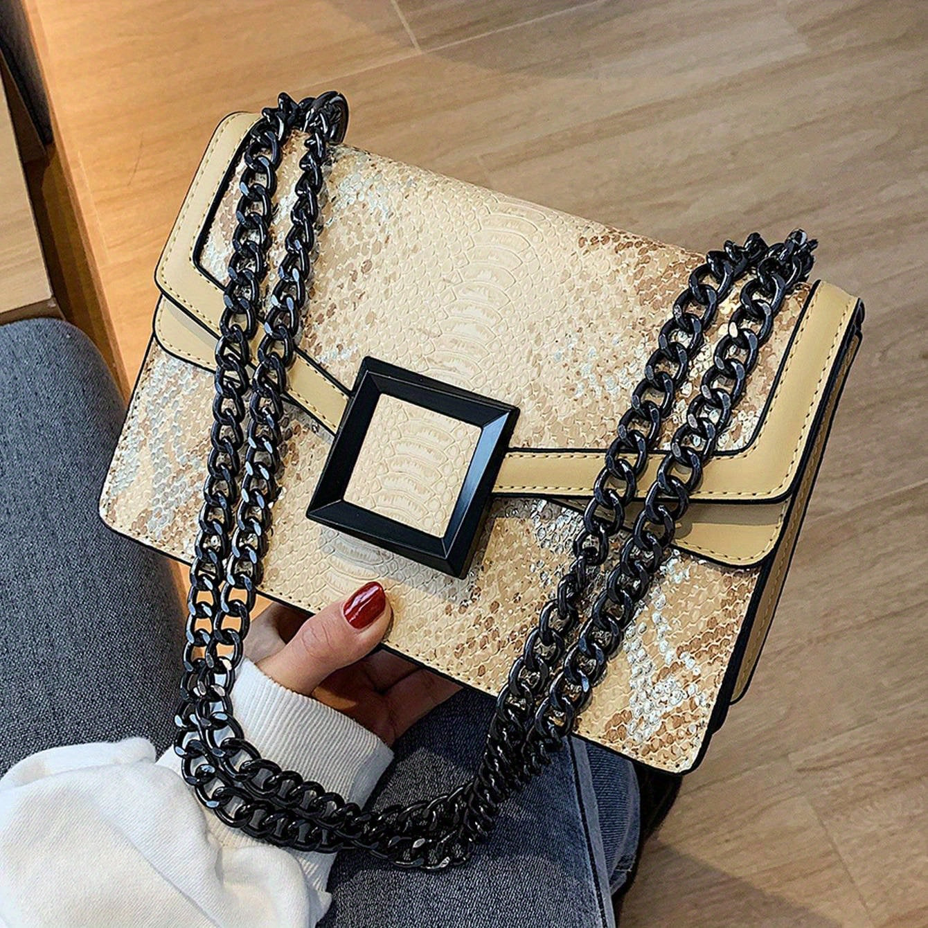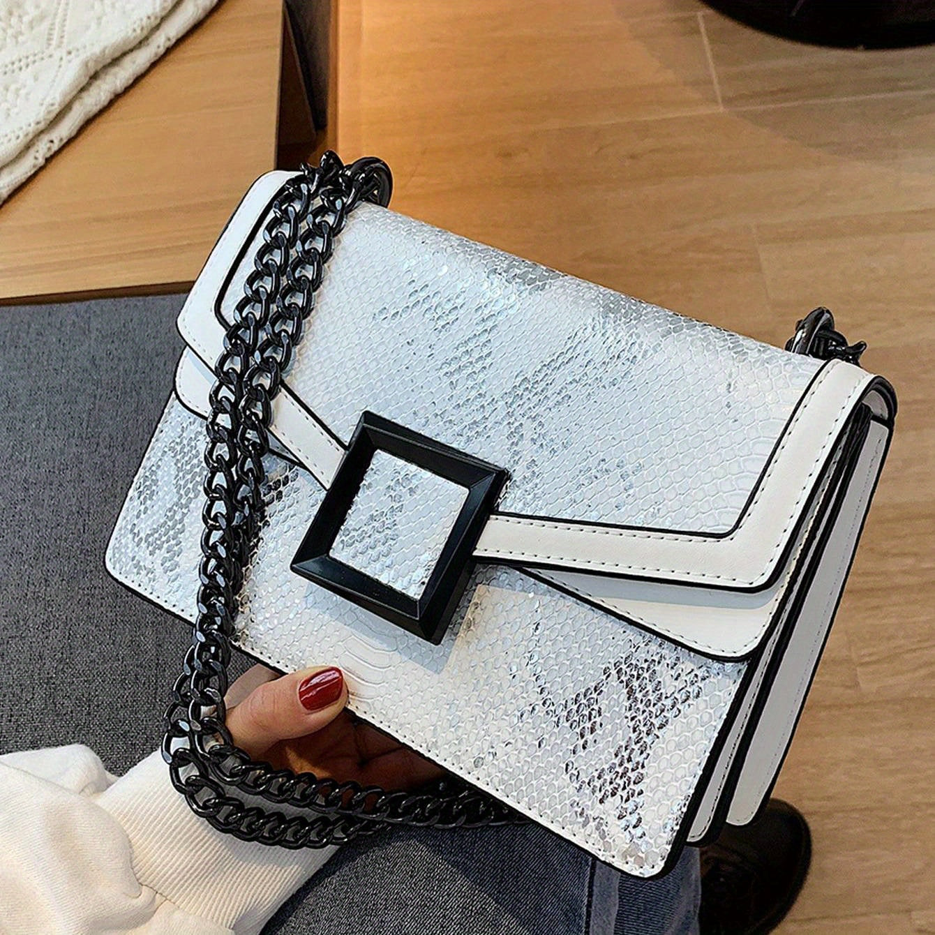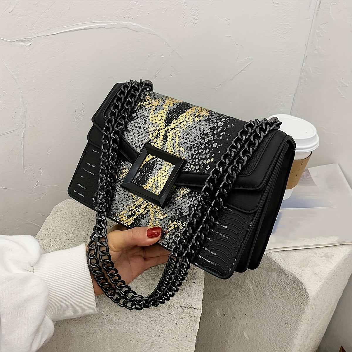 Elegant Crossbody Square Bag - Retro Snake Skin Pattern Bag - Classic Flap Chain Shoulder Bag