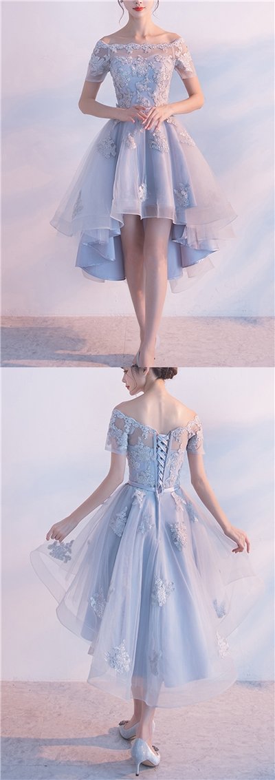 solvbao Grey High Low Lace Applique Round Neckline Prom Dresses, Homecoming Dresses, Lace-up Party Dresses