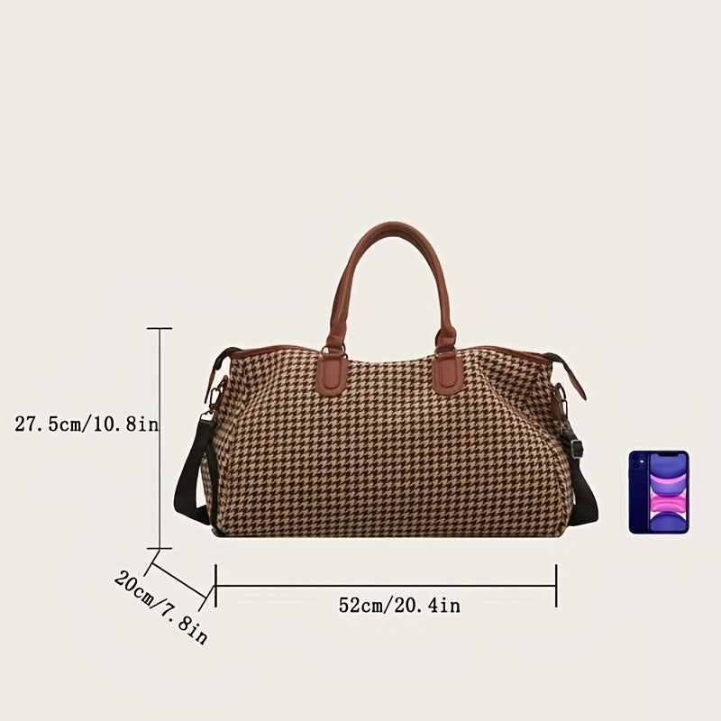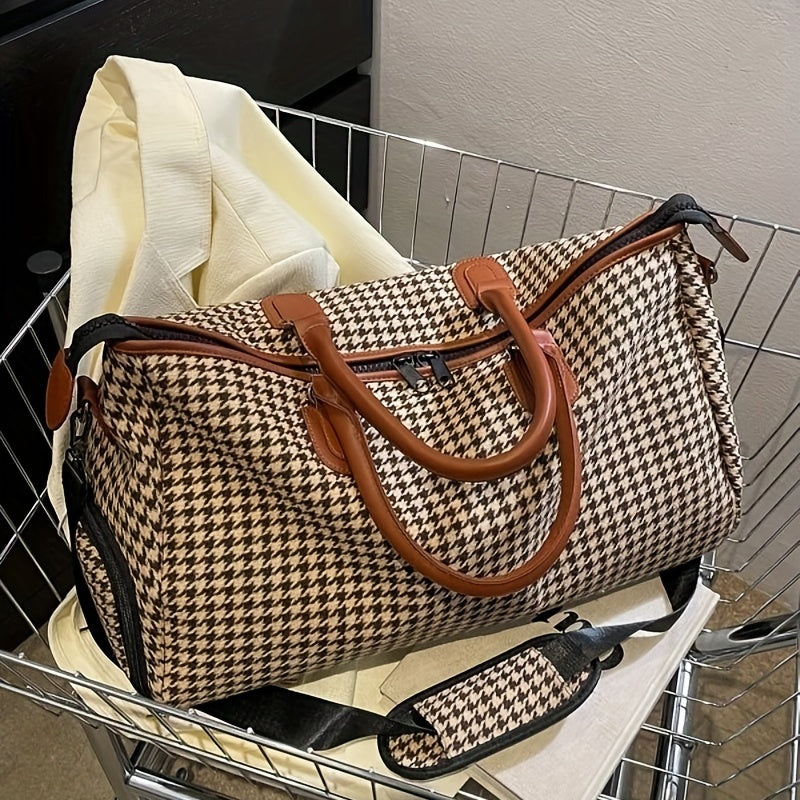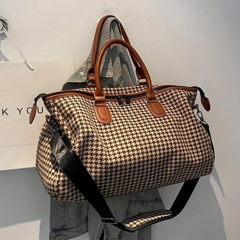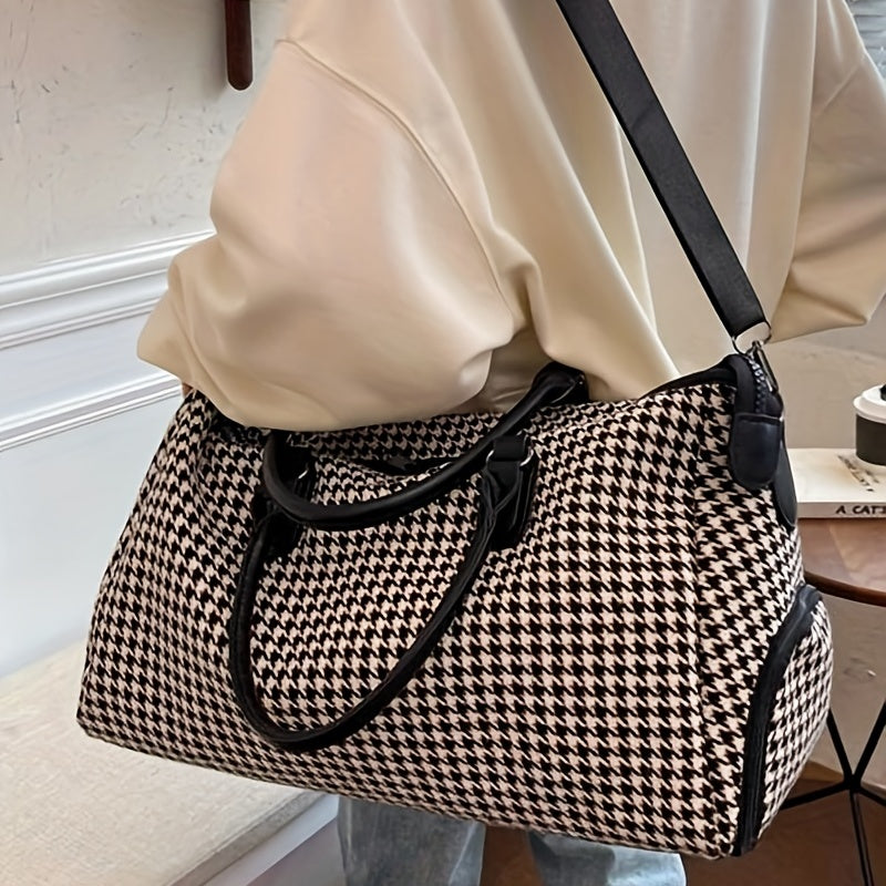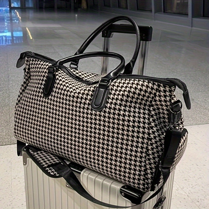 Houndstooth Pattern Travel Duffle Bag, Large Capacity Sports Fitness Bag, Carry On Weekender & Overnight Bag