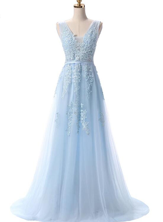 Solvbao Light Blue V-neckline Long Lace Applique Prom Dress, Tulle Formal Dress Evening Dress