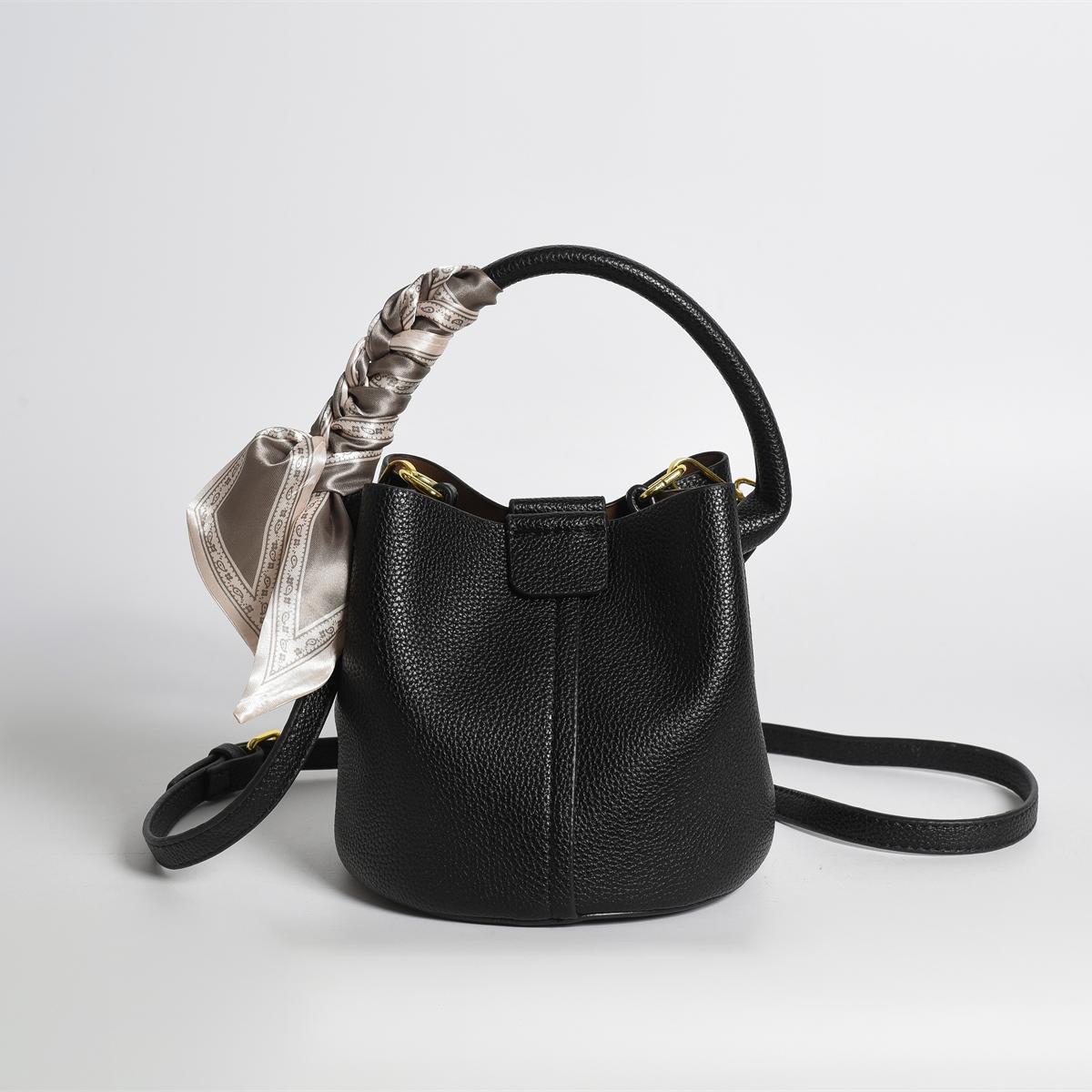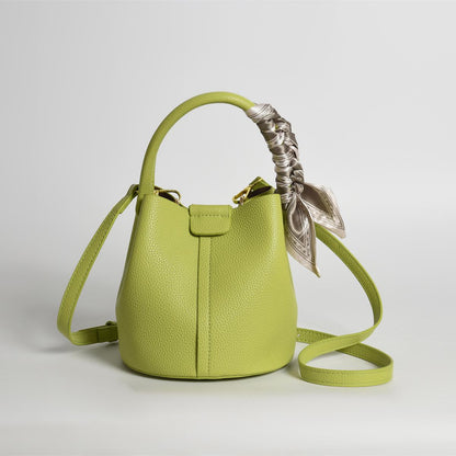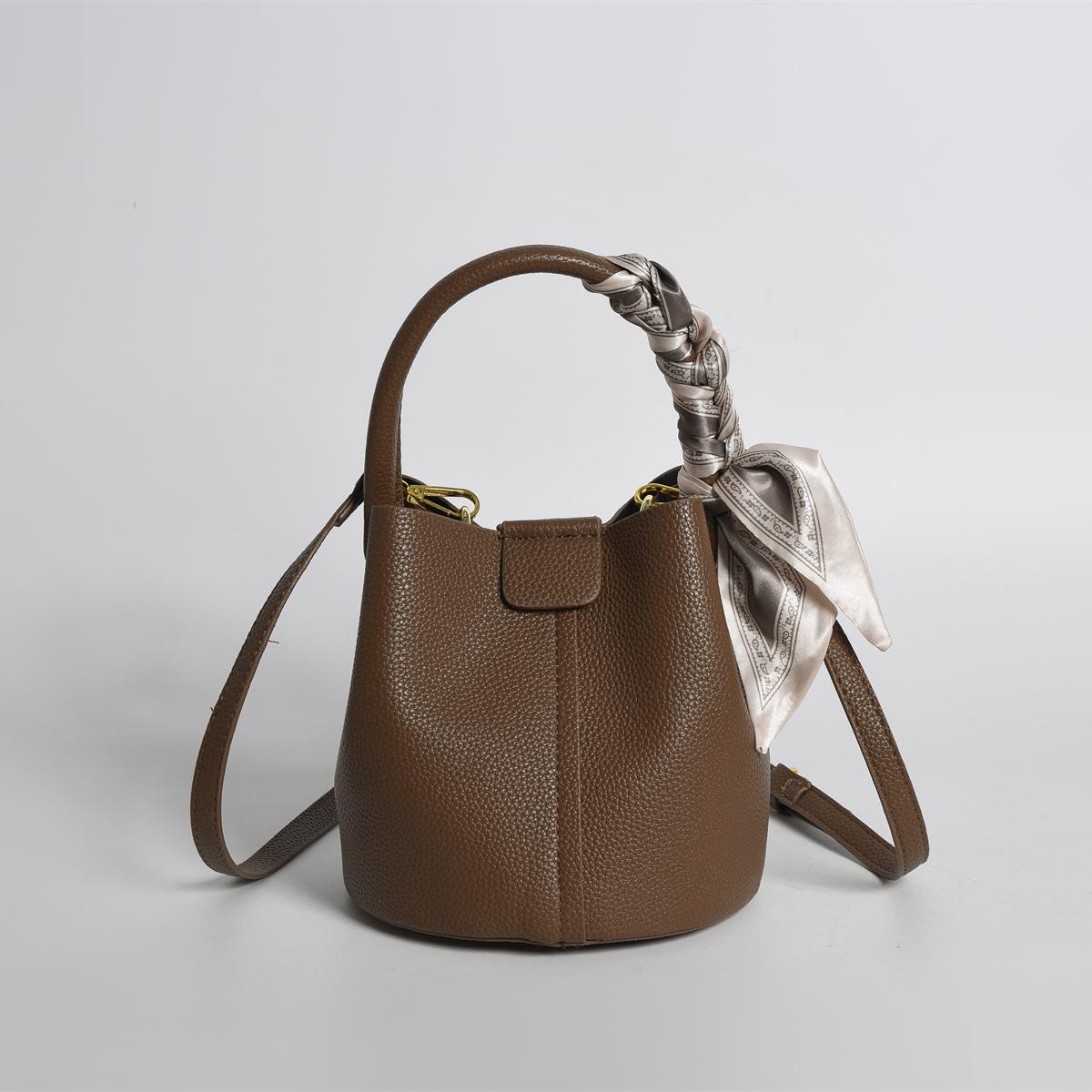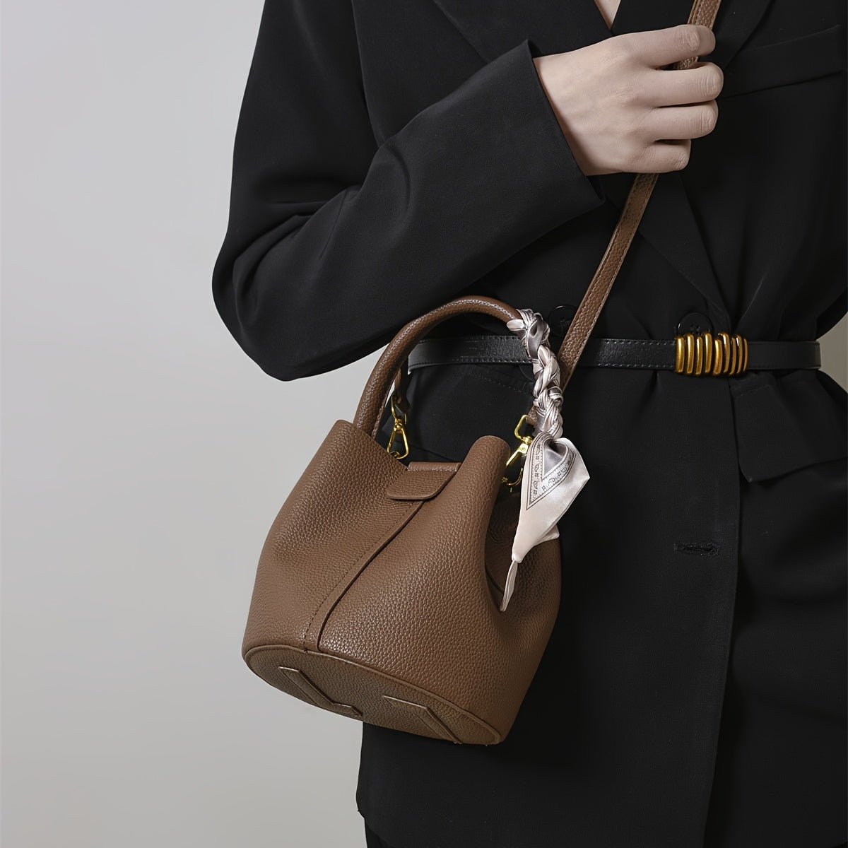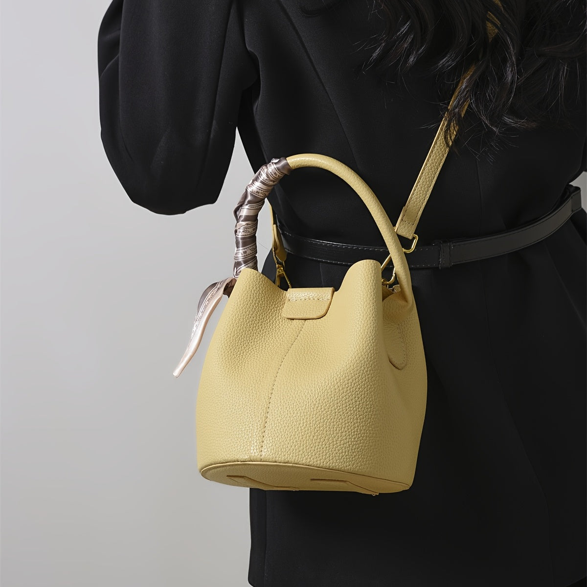 Litchi Embossed Top Handle Bucket Bag, Twilly Scarf Decor Crossbody Bag With Inner Pouch