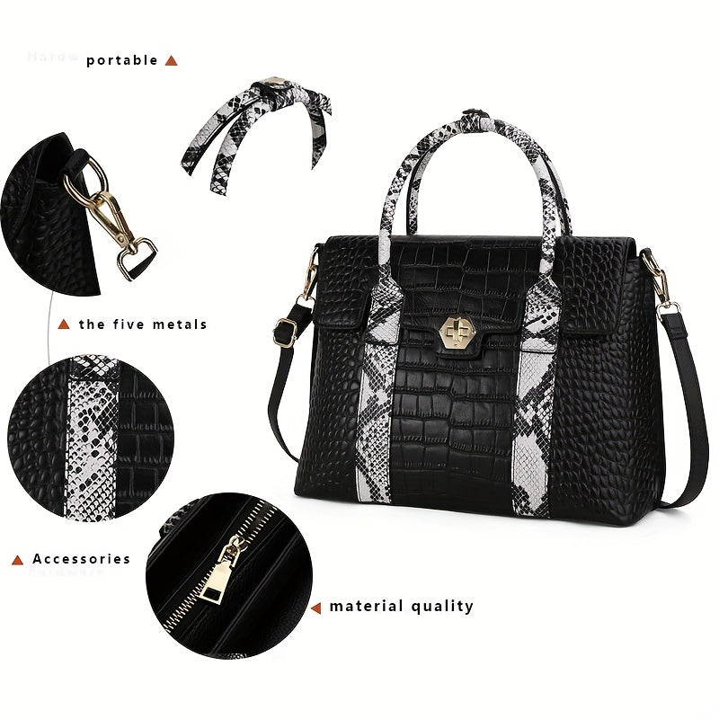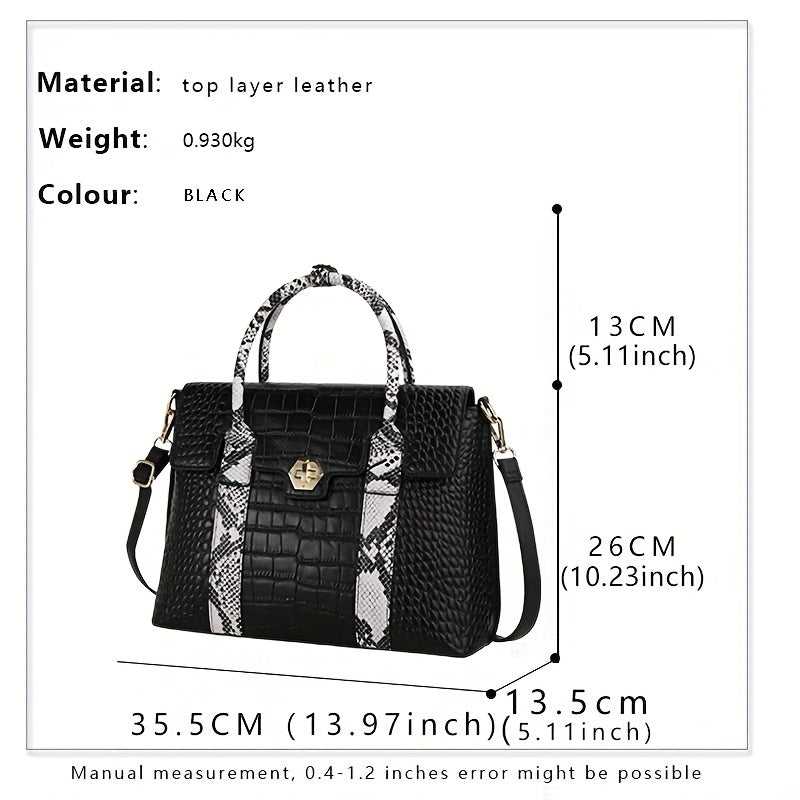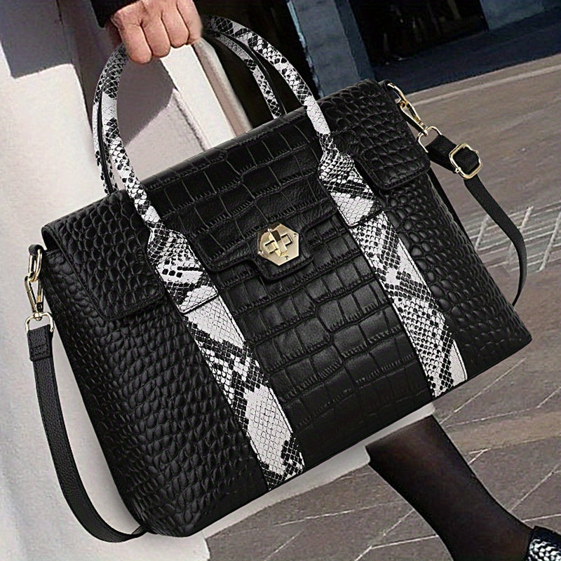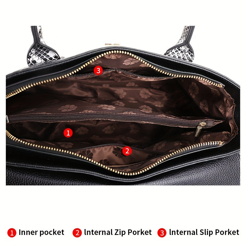 Luxury Leather Handbag For Women, Large Capacity Tote Bag, Stylish Satchel Purse With Snakeskin Pattern Handle
