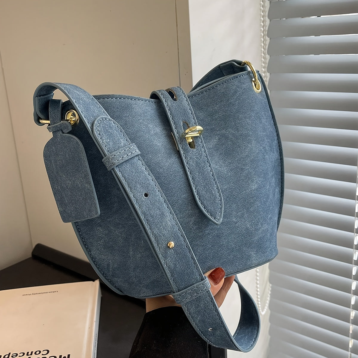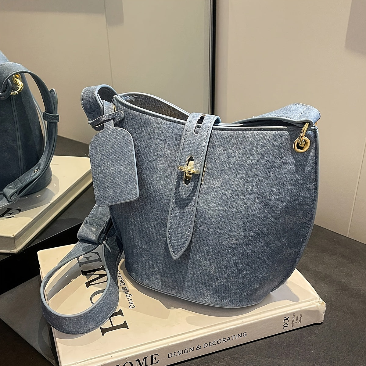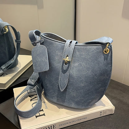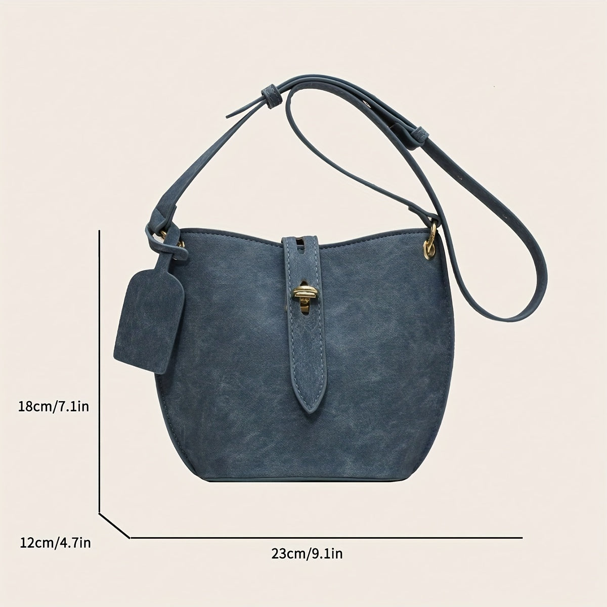 Niche Trendy Bucket Bag, Solid Color PU Leather Turn-Lock Shoulder Bag, Classic Women's Commuter Handbag
