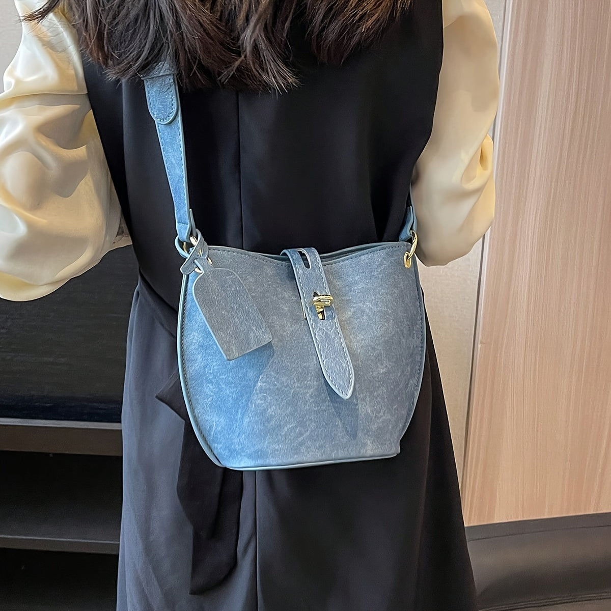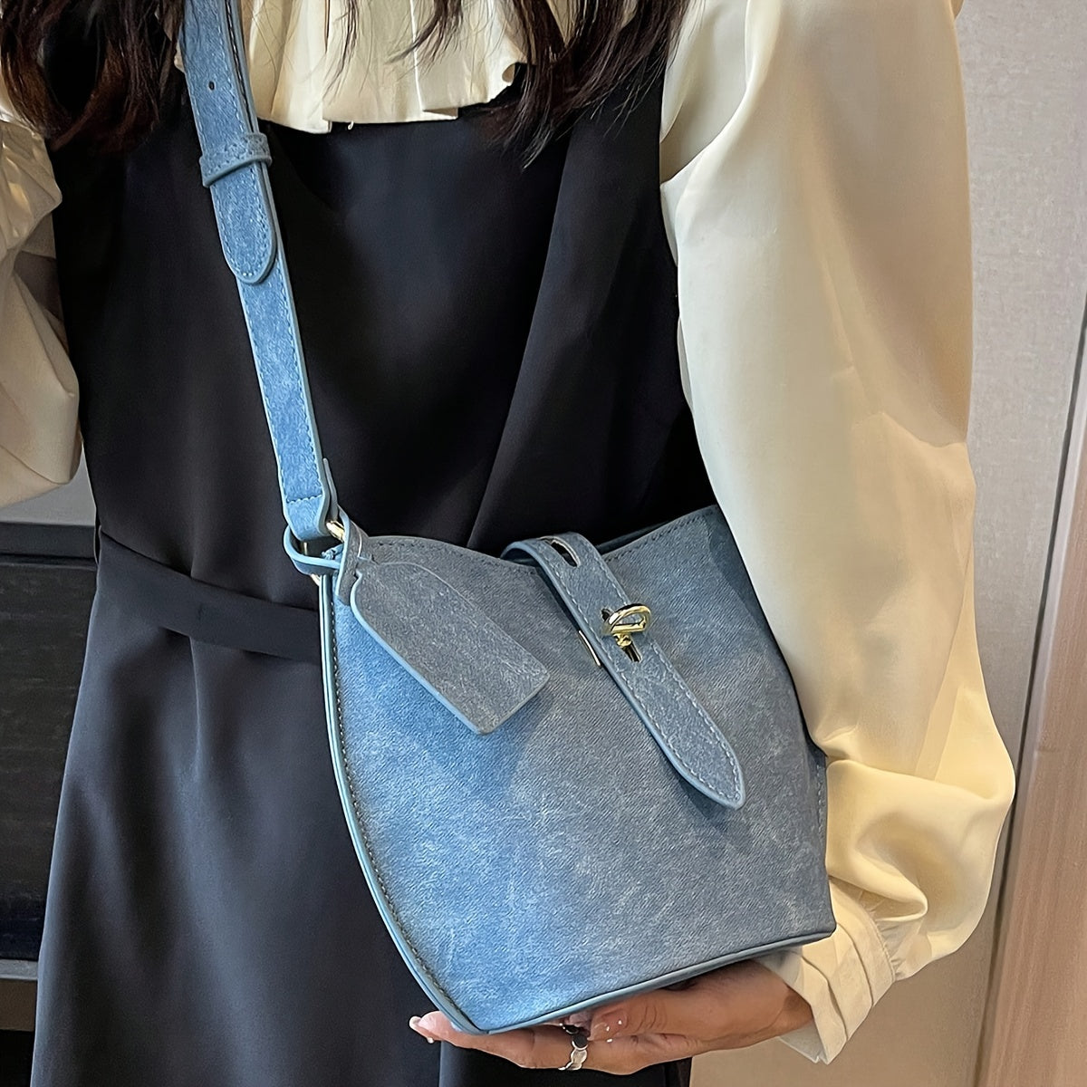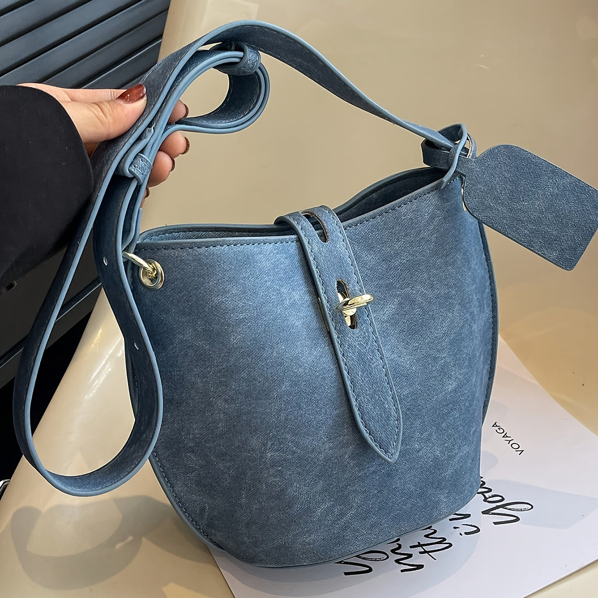 Niche Trendy Bucket Bag, Solid Color PU Leather Turn-Lock Shoulder Bag, Classic Women's Commuter Handbag