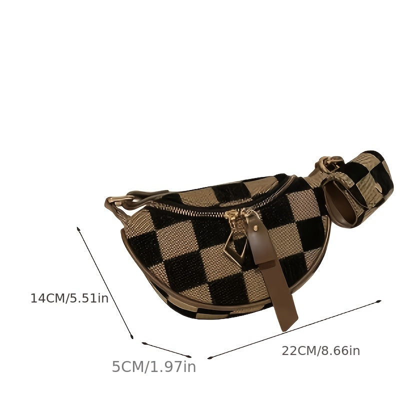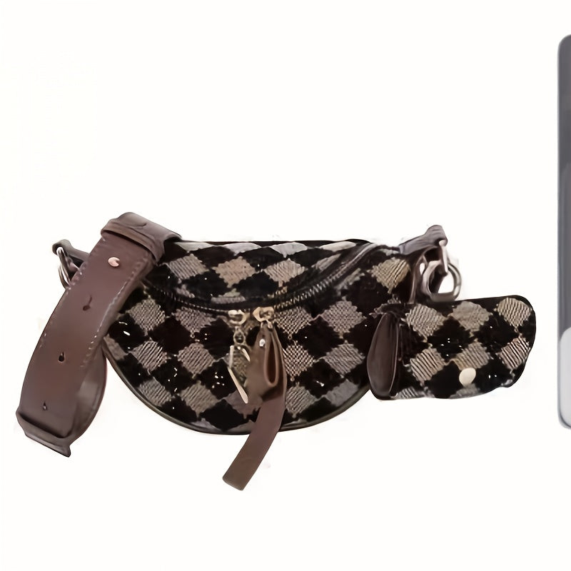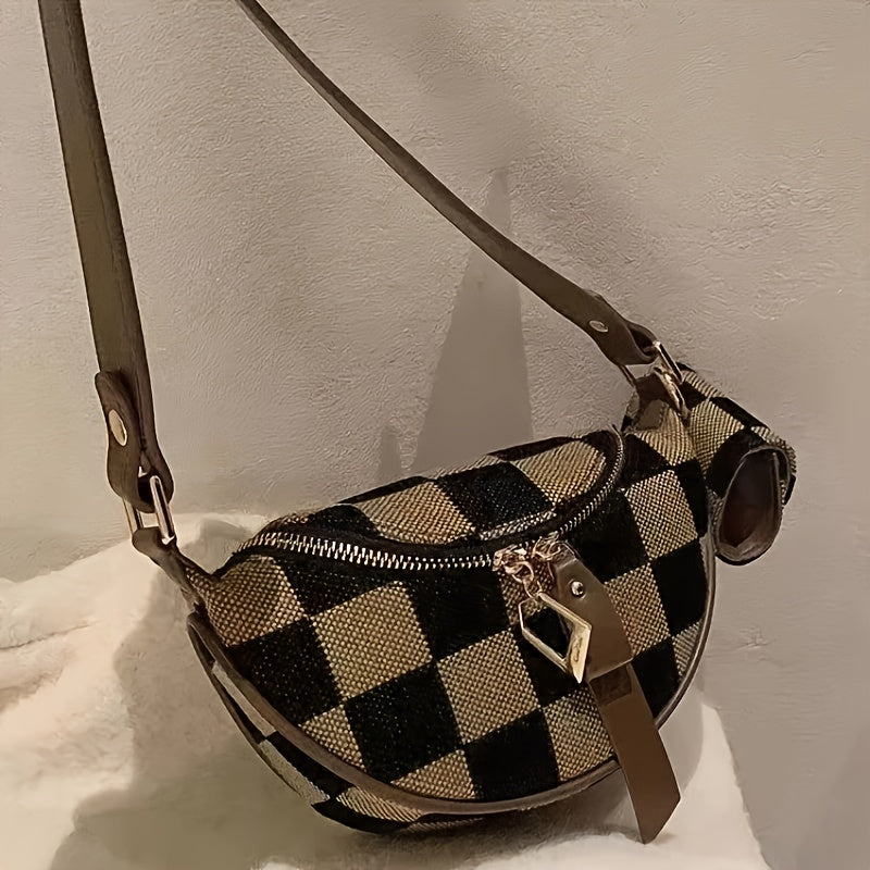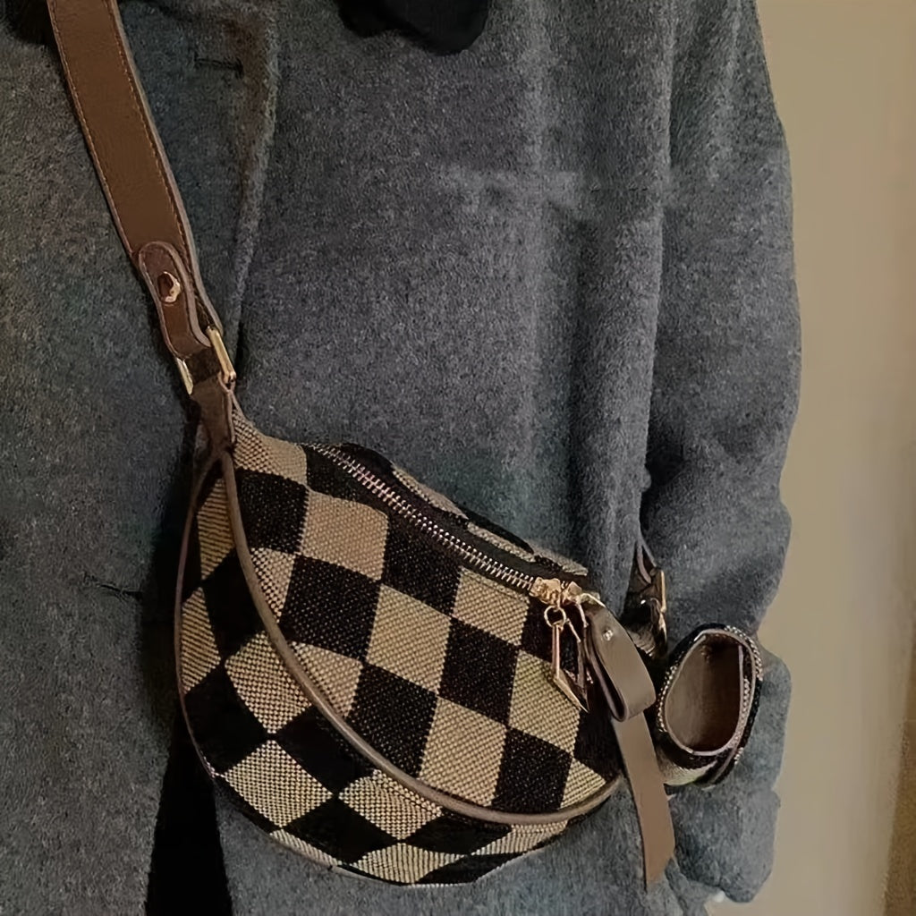 Retro Checkerboard Saddle Bag, Canvas Crossbody Bag For Women, Trendy Chest Bag With Mini Coin Purse