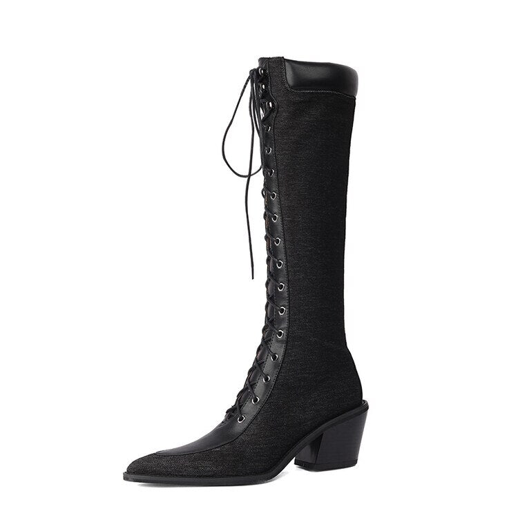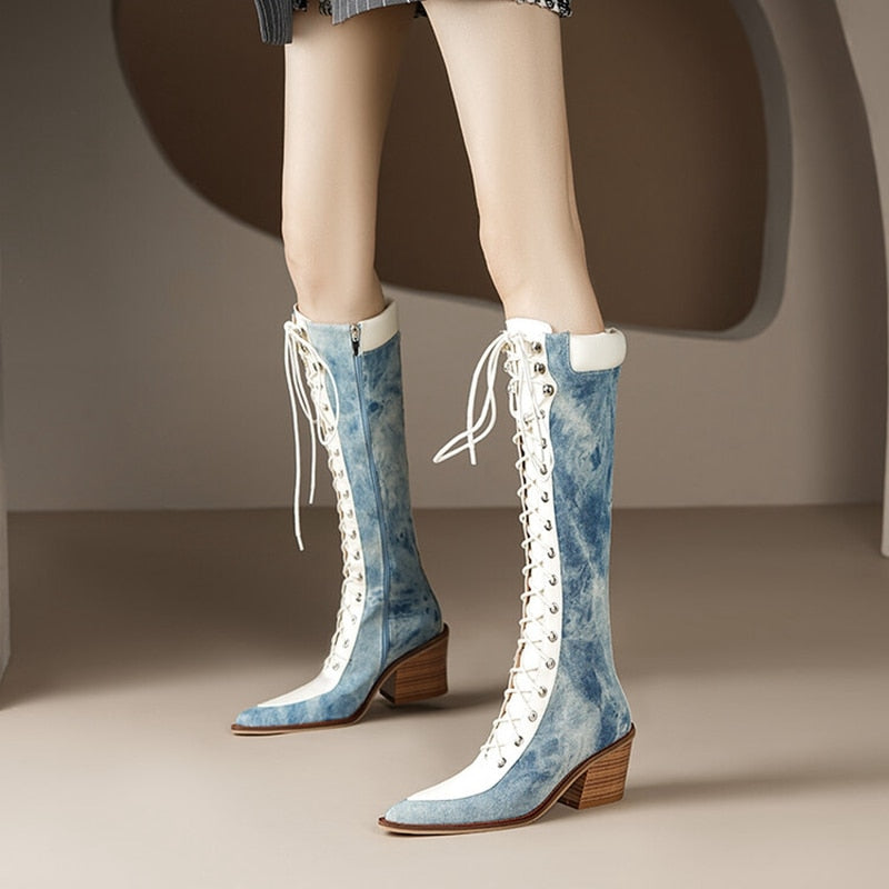 Solvbao Autumn Shoes Autumn Boots Women Jean Shoes for Women Pointed Toe Chunky Heel Western Boots Knee-High Boots Denim Boots казаки женские обувь