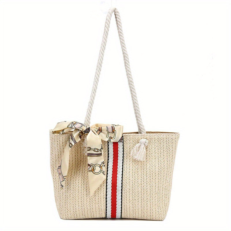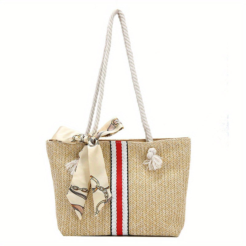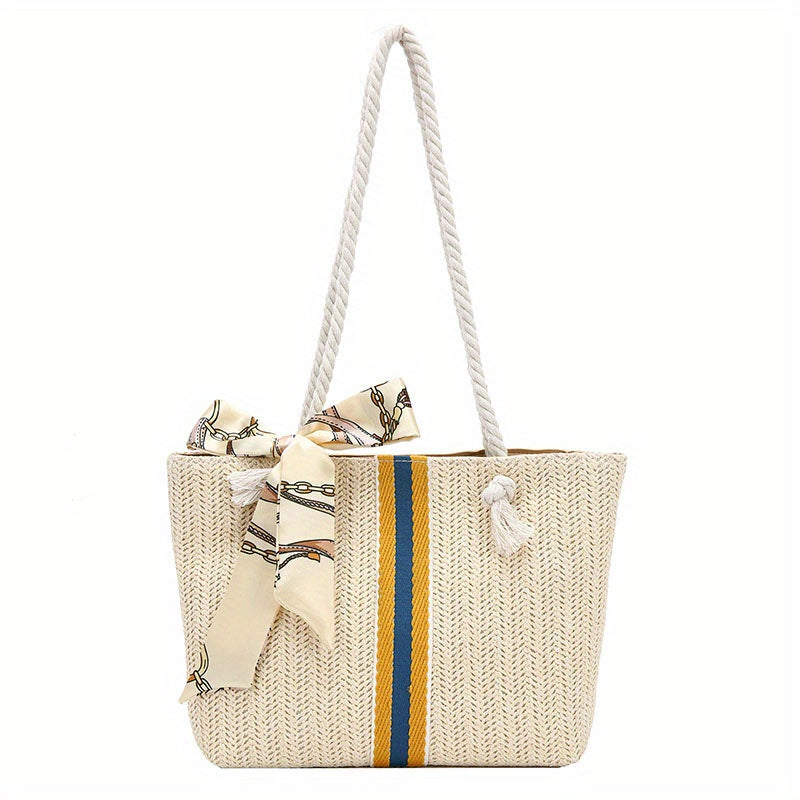 solvbao Striped Pattern Straw Tote Bag, Travel Beach Shoulder Bag, Simple Bag With Scarf Decor