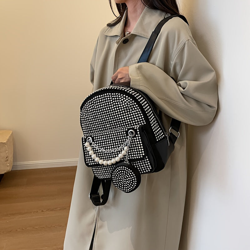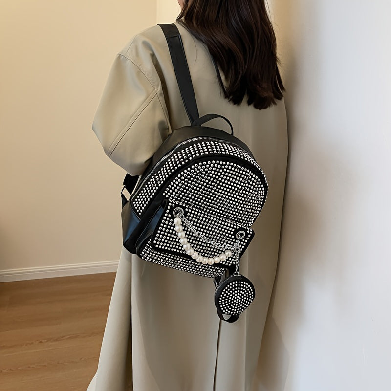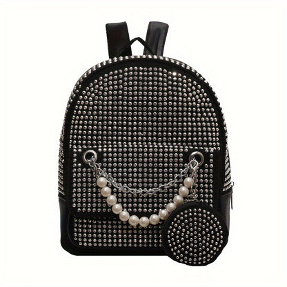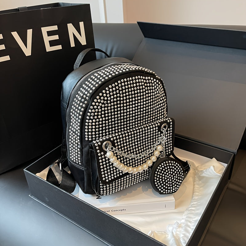 solvbao Trendy Rivet Decor Backpack, Faux Pearls Chain Decor Knapsack & Round Coin Bag, Perfect Daypack For Daily Use