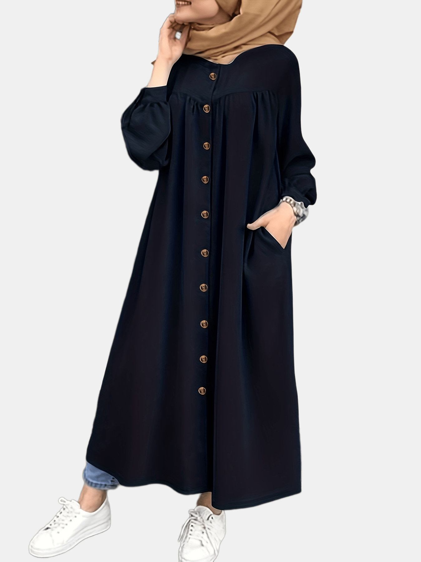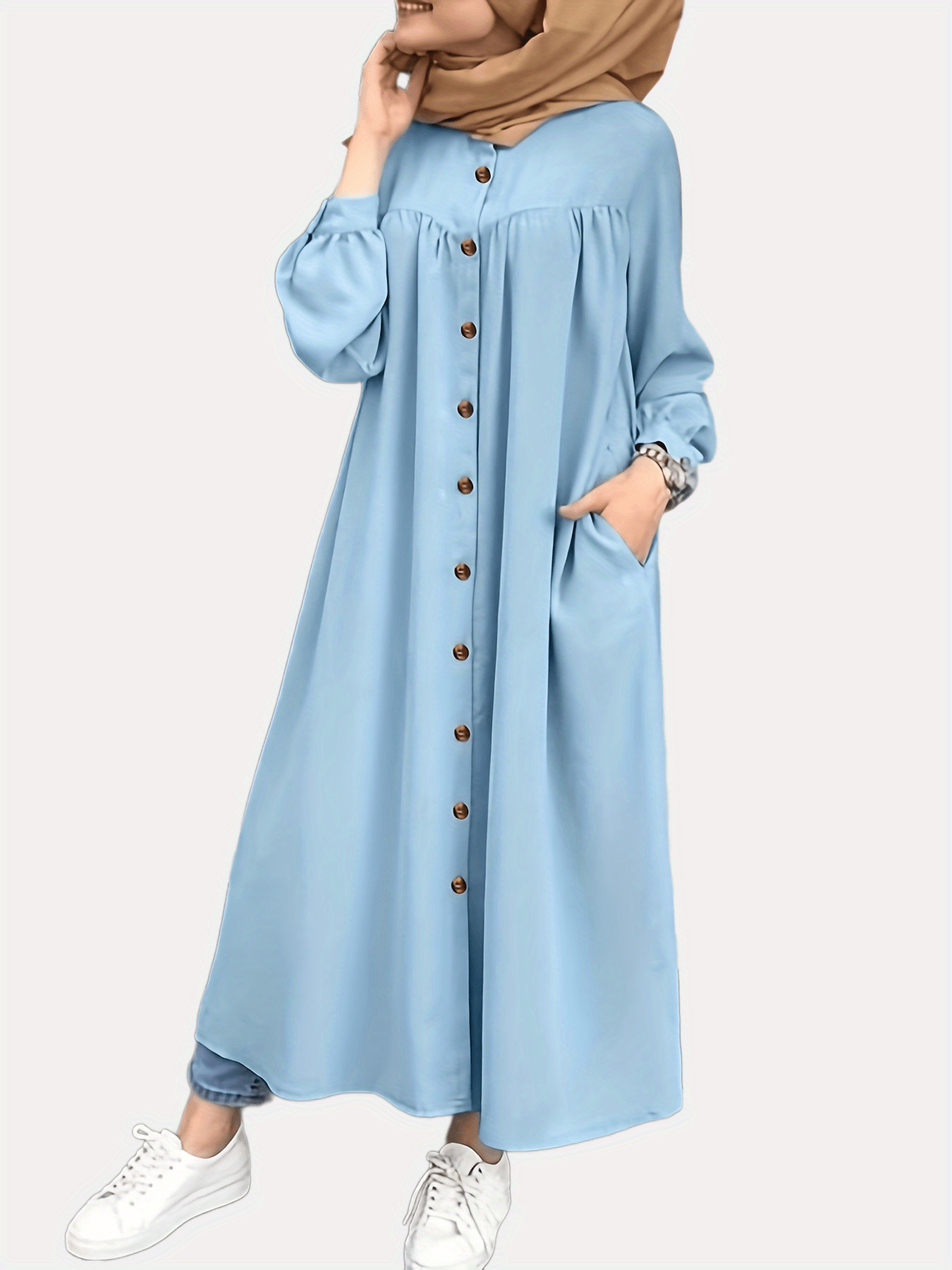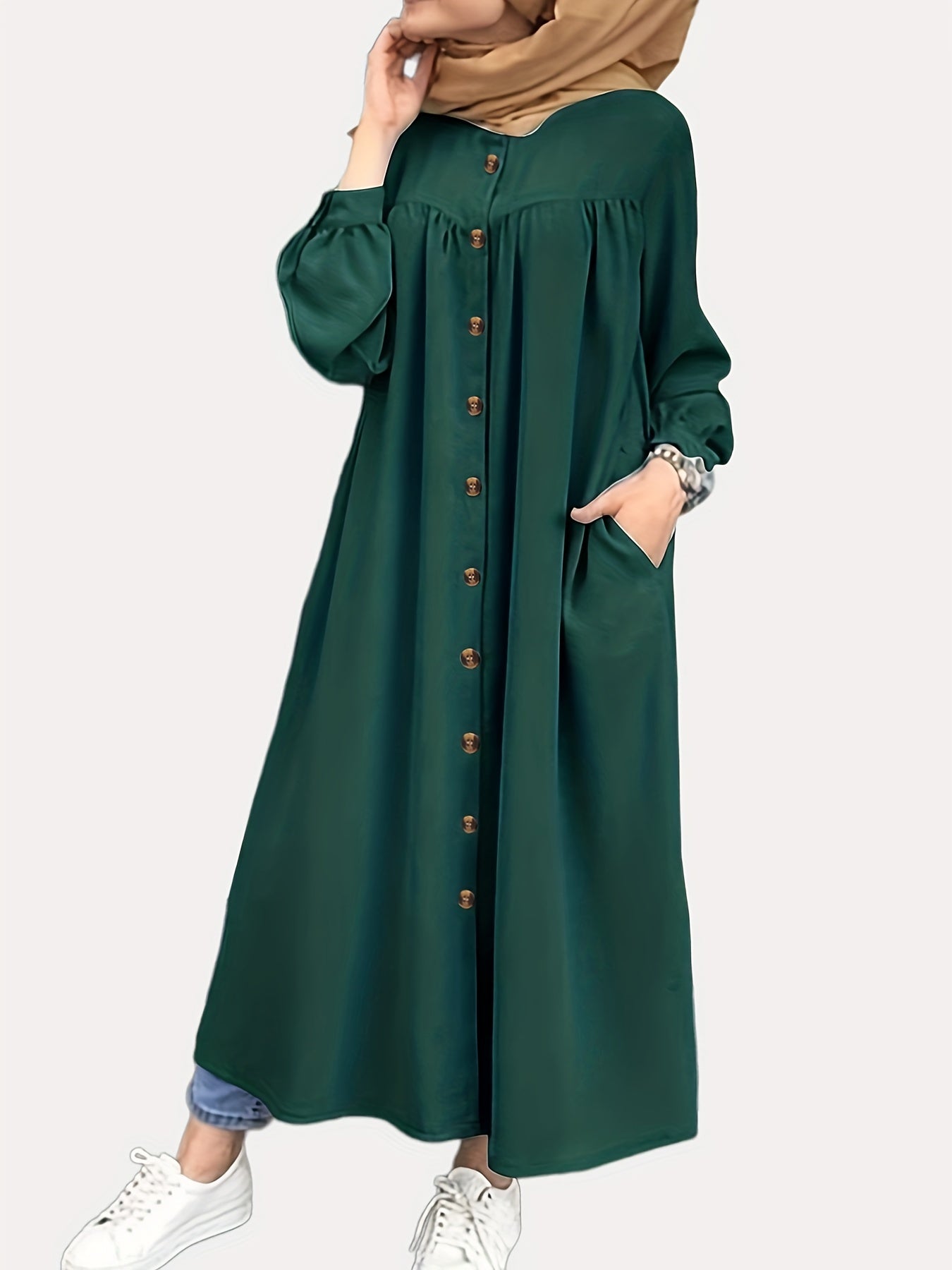 solvbaoButton Front Ruched Abaya, Modest Puff Sleeve Maxi Dress, Women's Clothing
