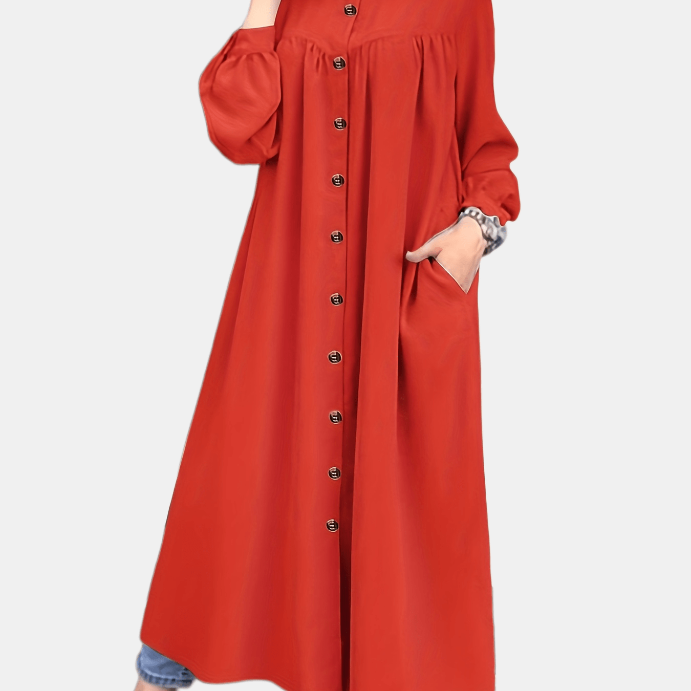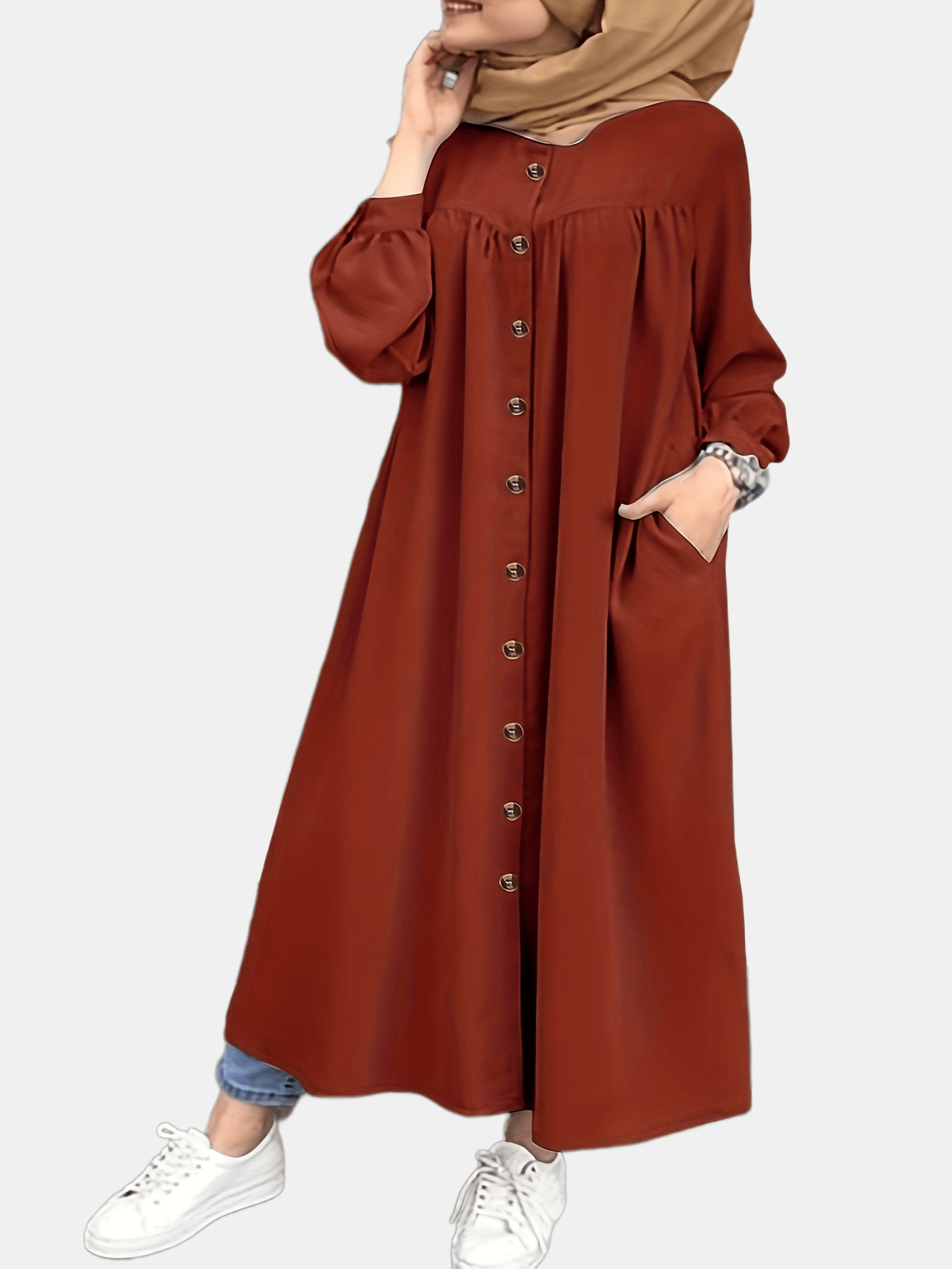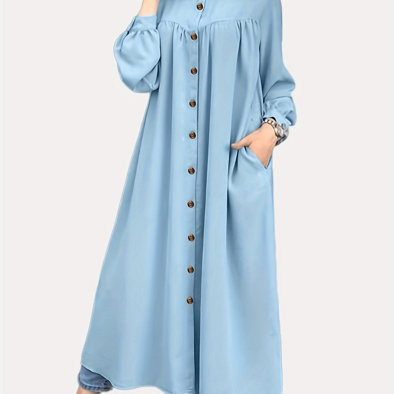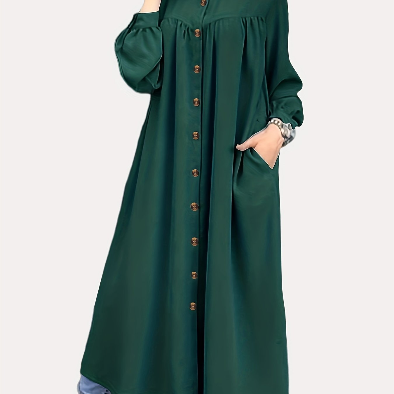 solvbaoButton Front Ruched Abaya, Modest Puff Sleeve Maxi Dress, Women's Clothing