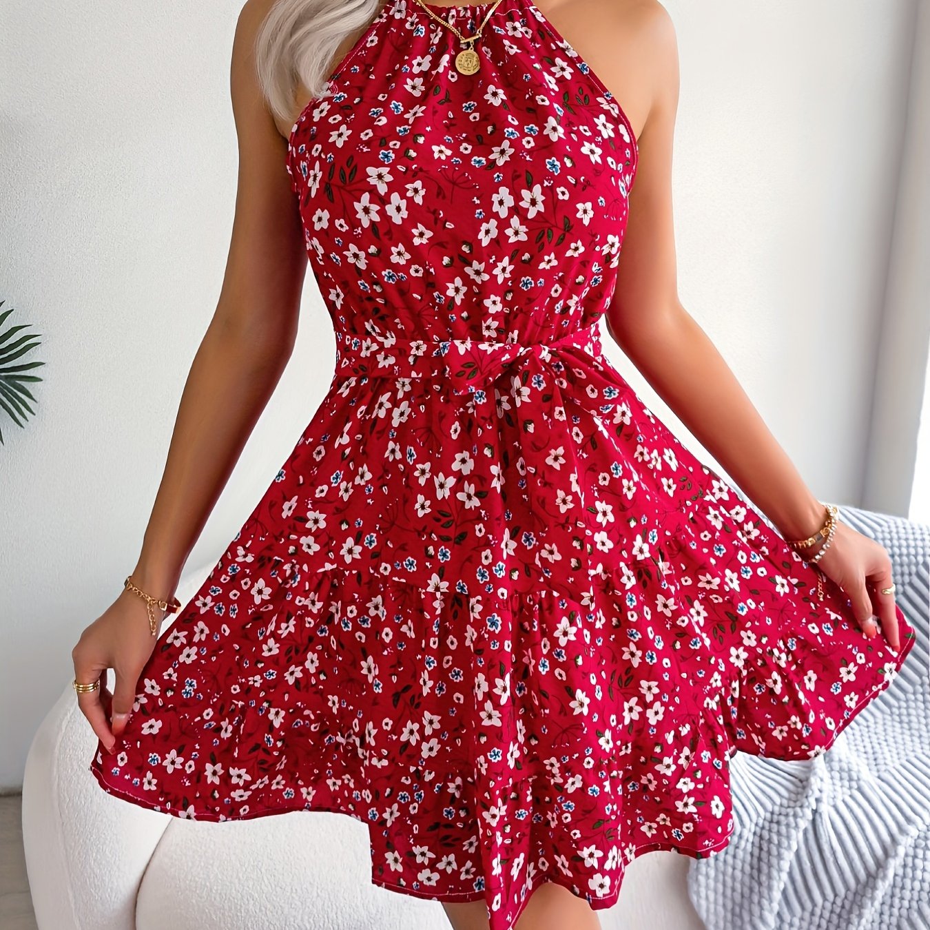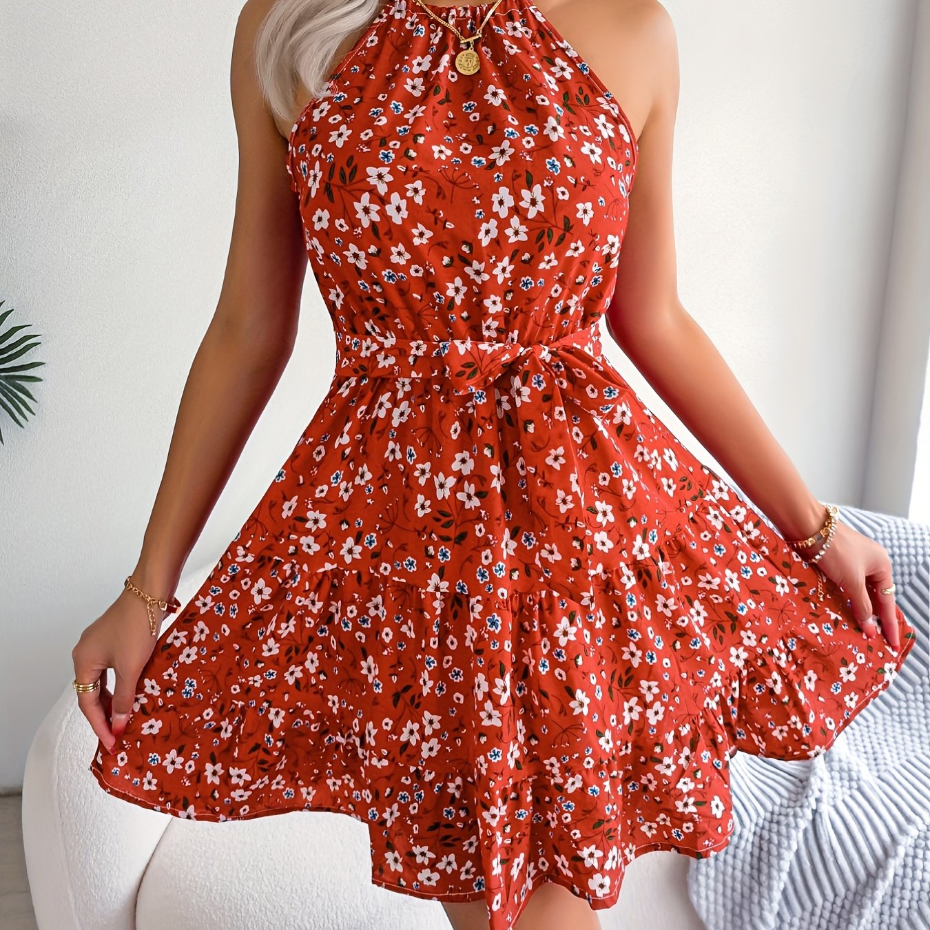 solvbaoFloral Print Belted Beach Dress, Sleeveless Casual Vacation Dress For Summer & Spring, Women's Clothing