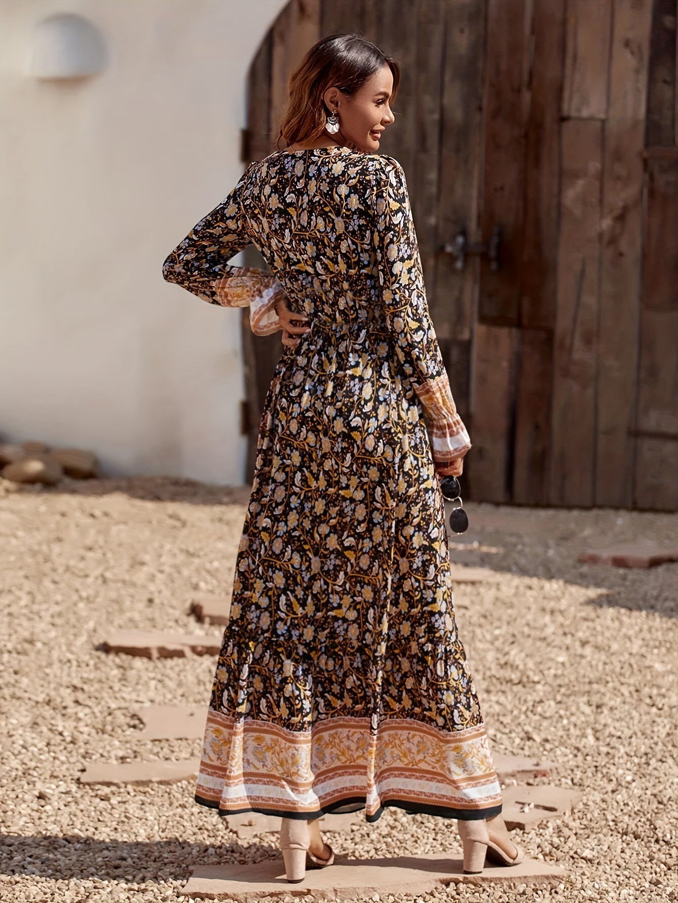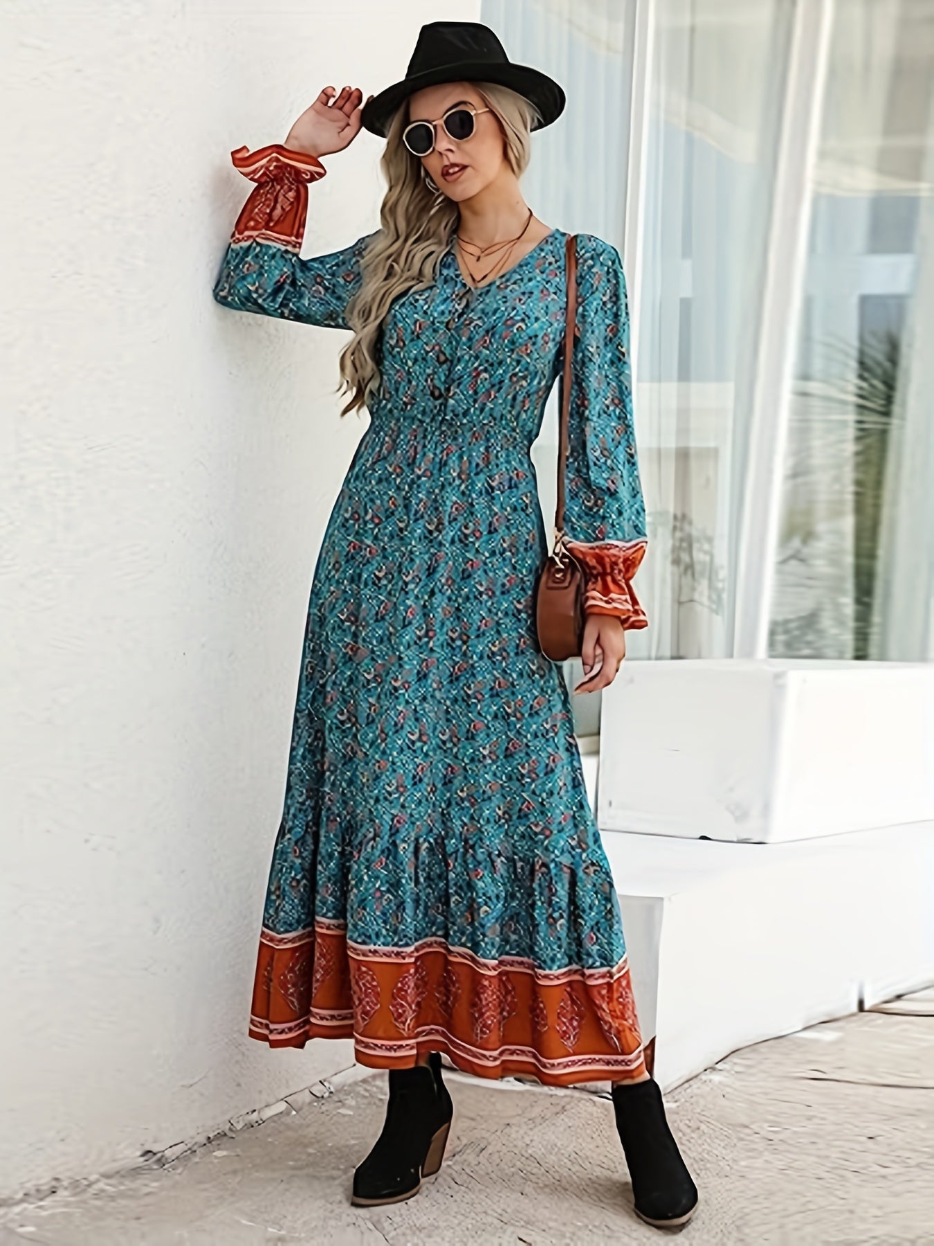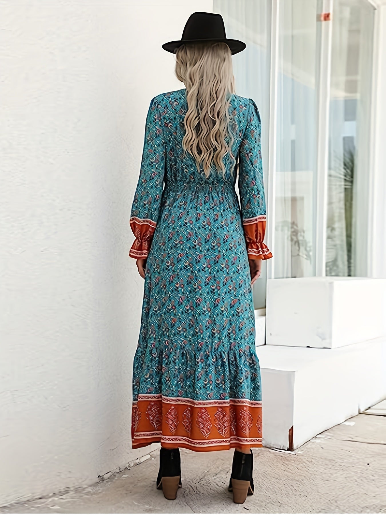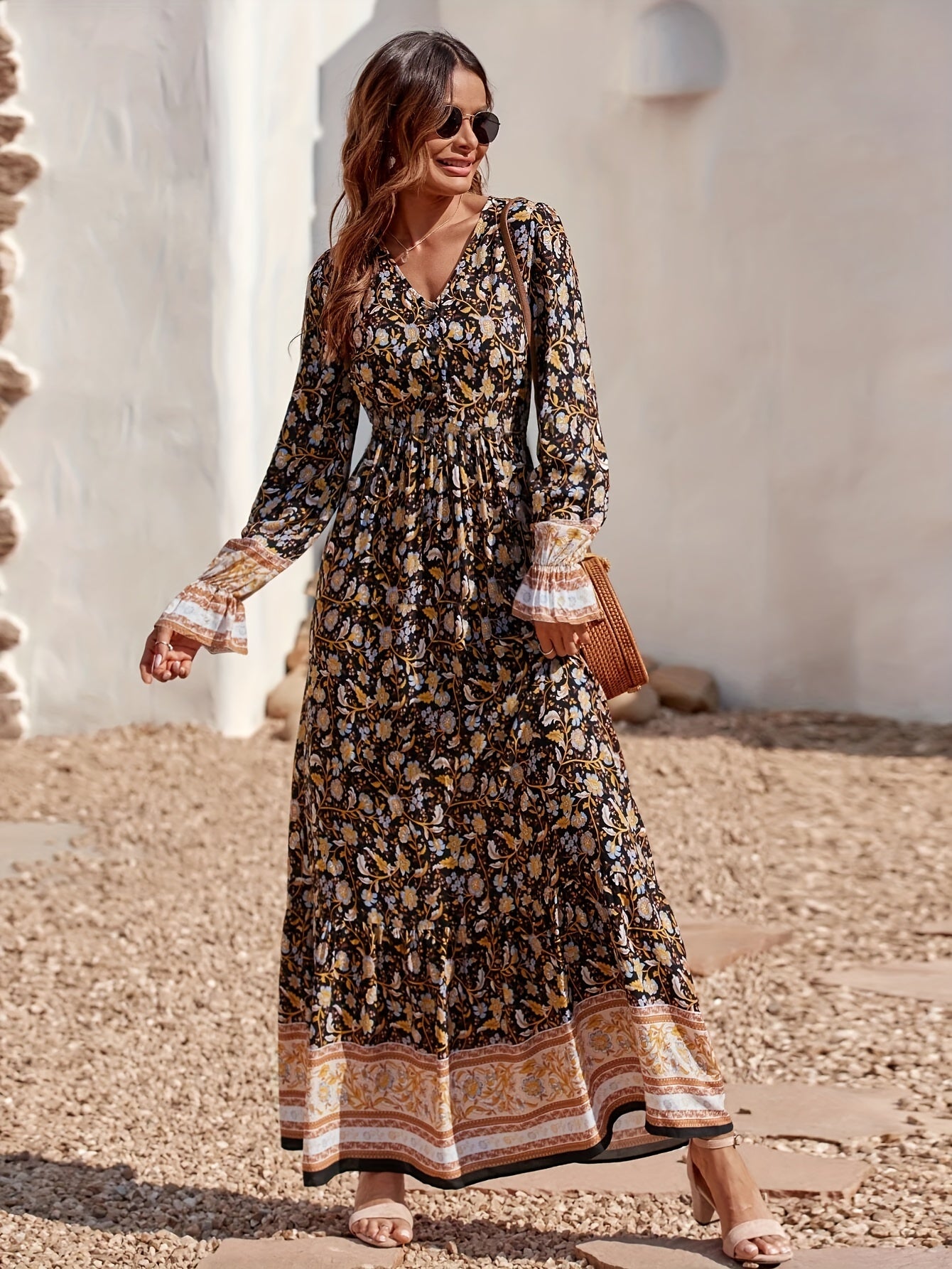 solvbaoFloral Print High Waist Dress, Boho V Neck Flared Sleeve Maxi Dress, Women's Clothing
